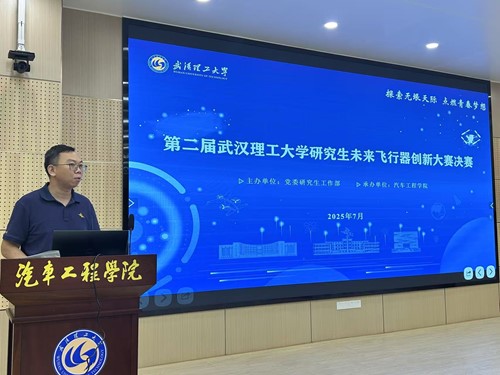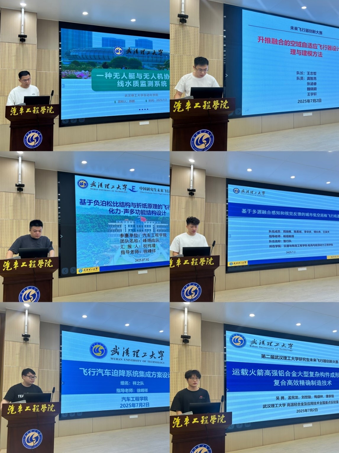 In response to the national strategy of building a strong space nation, to continuously stimulate the innovative enthusiasm of our university's postgraduate students in the aerospace field, enhance their scientific research and practical abilities, and discover high-quality and top-notch innovative talents, the final of the second Wuhan University of Technology Postgraduate Future Aircraft Innovation Competition was successfully held in the Baolong Technology Lecture Hall of the School of Automotive Engineering on the morning of July 2nd. This competition is hosted by the Graduate Affairs Department of the University Party Committee and organized by the School of Automotive Engineering. With the theme of "Exploring the Boundless Horizon, Igniting Youthful Dreams", it aims to encourage students to be courageous in breaking through and innovating, and promote the integrated development of cutting-edge technologies. After the preliminary review, a total of 8 teams from 4 colleges across the university were shortlisted for the final. CAI Chun, the deputy secretary of the Party Committee of the School of Automotive Engineering, and Pan Peng, the postgraduate counselor, attended the final. Zhu Dahu and Wu Mengwu, teachers from the School of Automotive Engineering, Zhou Quan from the School of Automation, and Liu Bao from the School of Transportation and Logistics served as judges for the final. Representatives of postgraduate students from various colleges were present to observe and learn, and the academic atmosphere on the spot was very strong.