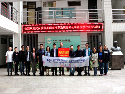 武汉彼欧英瑞杰汽车系统有限公司嘉宾与bevictor1946韦德官网领导共同合影留念。捐赠仪式结束后,公司研发中心经理考斯特为公司研究生带来汽车供油系统前沿技术专题报告。