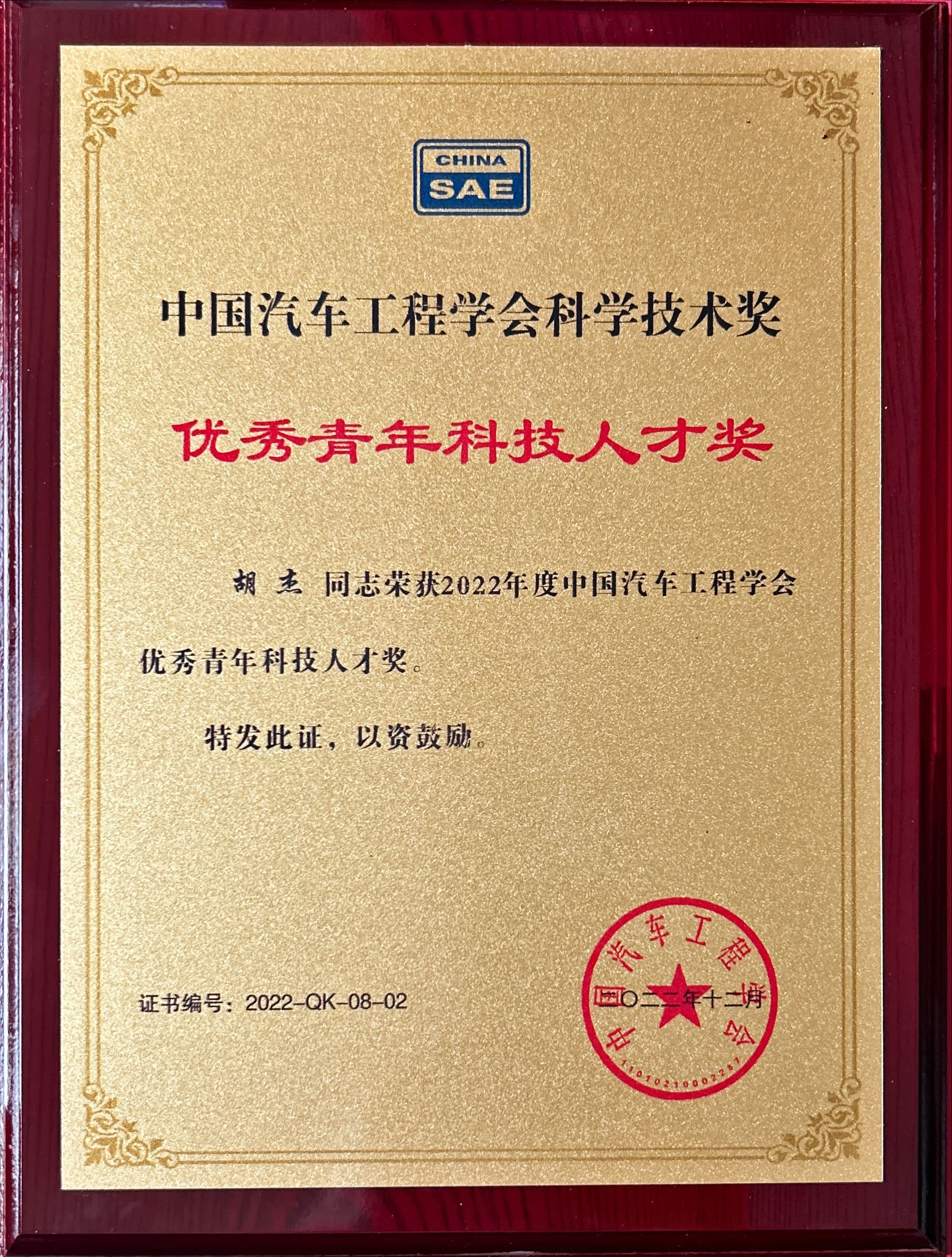 胡杰教授荣获2022年度中国汽车工程学会优秀青年科技人才奖。