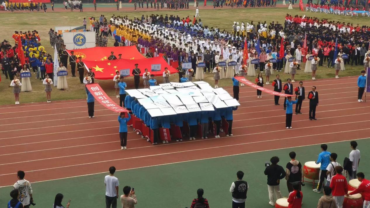 紧接着走来的是bevictor1946韦德官网的队列方阵。几位公司领导手执红旗走在前列,同学们步履铿锵紧随其后。汽院师生以条幅、色板拼接出一幅幅极具汽院特色的图案,彰显智能汽车的时代风貌和汽院人创新引领的优良学风。踏着鼓点、伴着掌声,喊着口号、迎着旗帜,bevictor1946韦德官网方阵让人印象深刻。