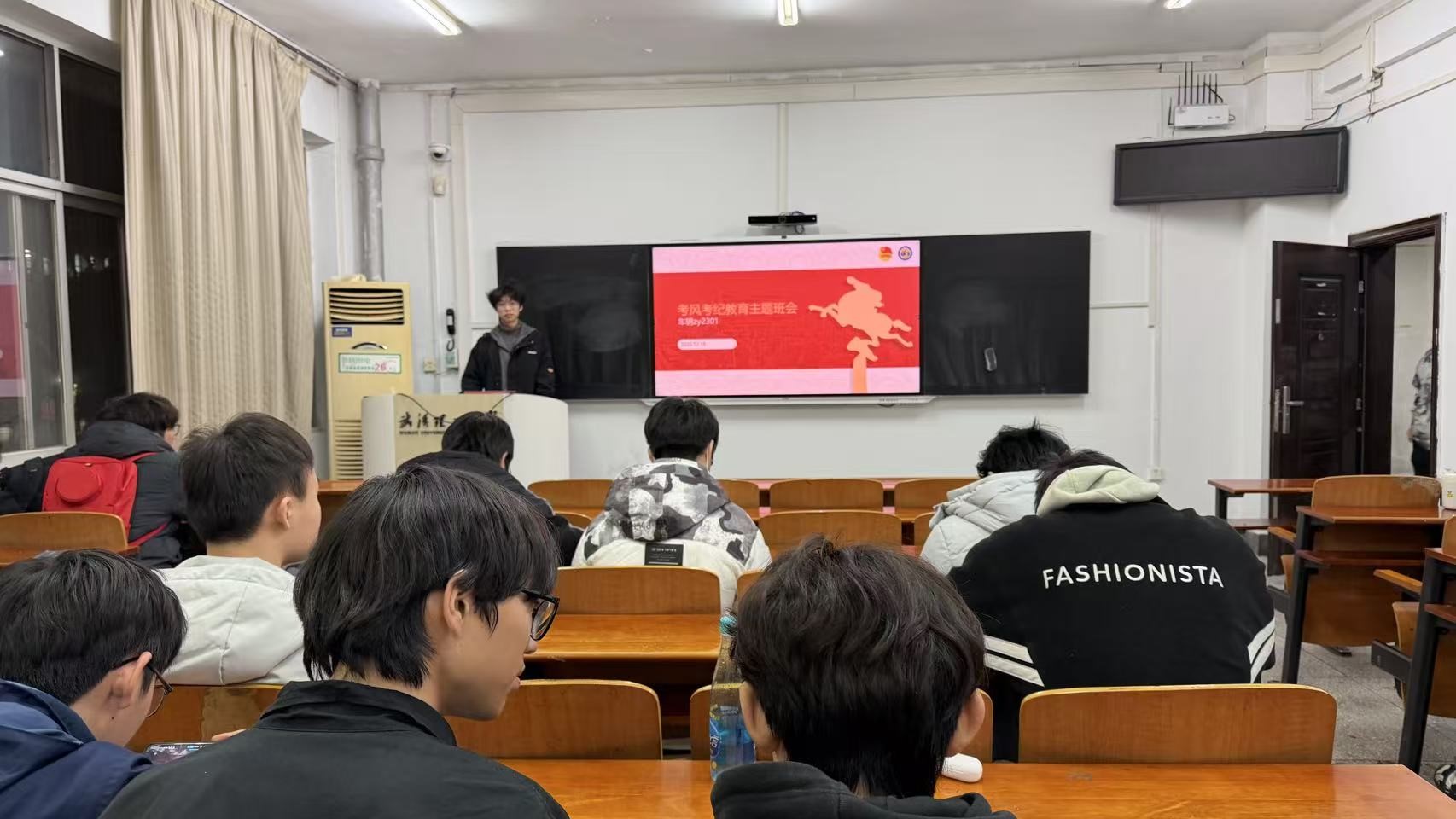 2025年12月16日晚,车辆zy2301班在致远楼211教室召开了“诚以立学,信以致远”考风考纪主题教育班会。班会由班长黄其妙主持,旨在期末考试来临之际,严肃考试纪律,强化学术道德,倡导诚信应考,营造公平、公正、严谨的优良考风。