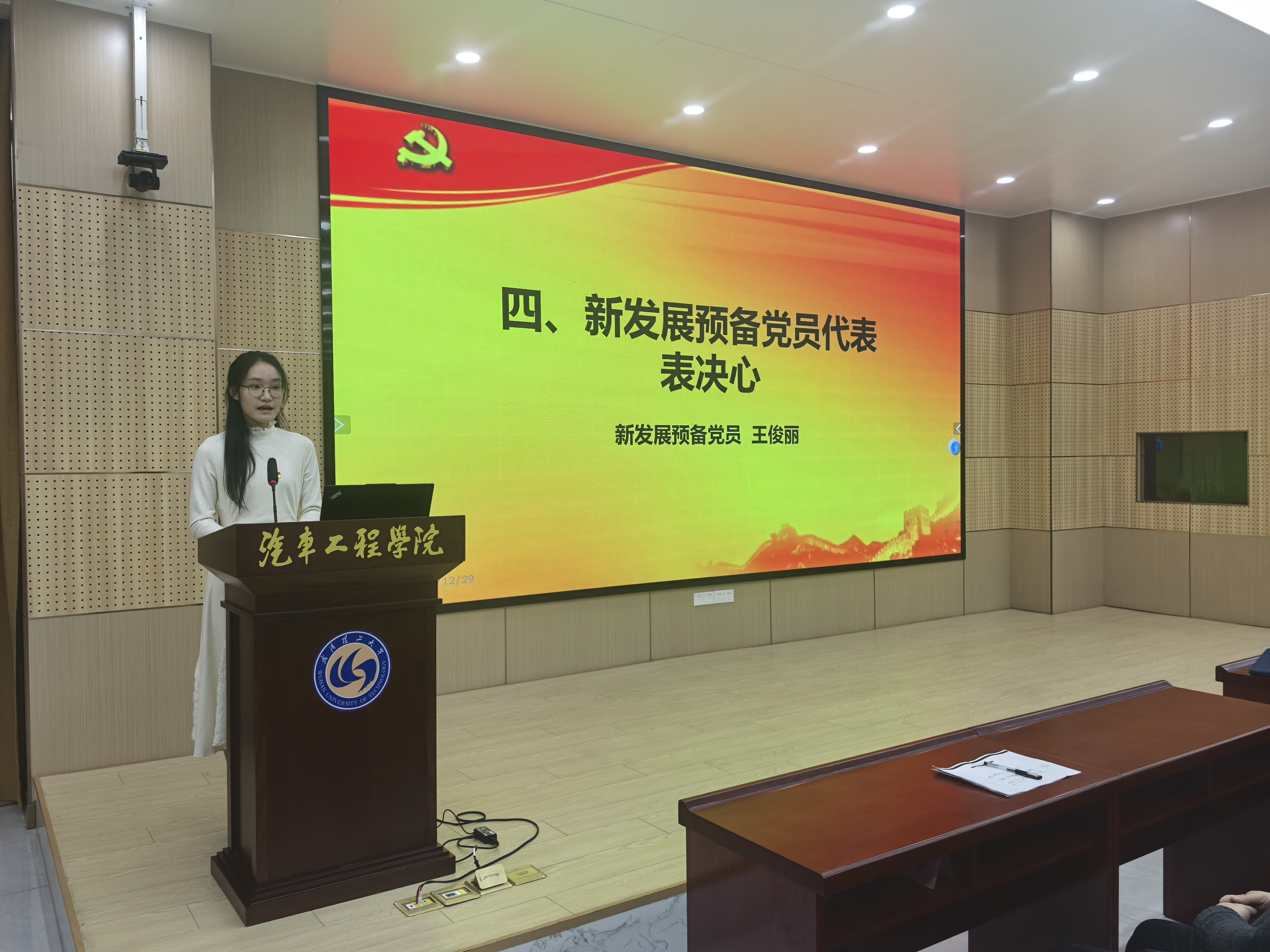 车辆2305班王俊丽同志作为新党员代表进行表态发言。她深情回顾了从递交入党申请书到面向党旗庄严宣誓的成长轨迹,字里行间满含对党组织信任与悉心培养的感恩之情。王俊丽以“感恩、自省、践行”三个关键词,分享感悟并作出郑重承诺:感恩党和人民的培育,将把红色精神力量转化为奋进动力;以党员标准严格自我检视,持续深化思想建设,筑牢理想信念之基;在理论学习、服务群众与专业钻研中躬身践行,立志成长为德才兼备的社会主义事业建设者和合格接班人。